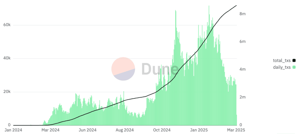 Solana blockchain’indeki günlük işlem sayısı, 23 Ocak’taki 71.738’lik tüm zamanların en yüksek seviyesinden 17 Mart’ta 24.505’e geriledi; aşağıdaki grafikte bu değişiklik gösterilmektedir.