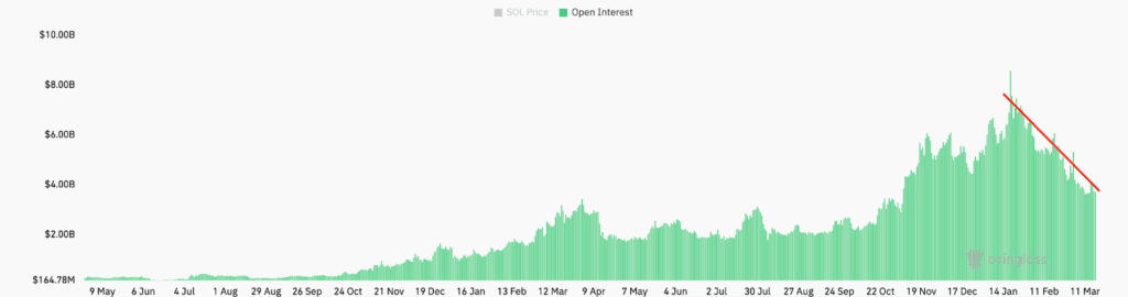 Solana’nın vadeli işlemler piyasasındaki OI’si, 17 Ocak’taki 8,57 milyar dolarlık yerel zirvesinden 17 Mart itibarıyla 4,03 milyar dolara düştü.